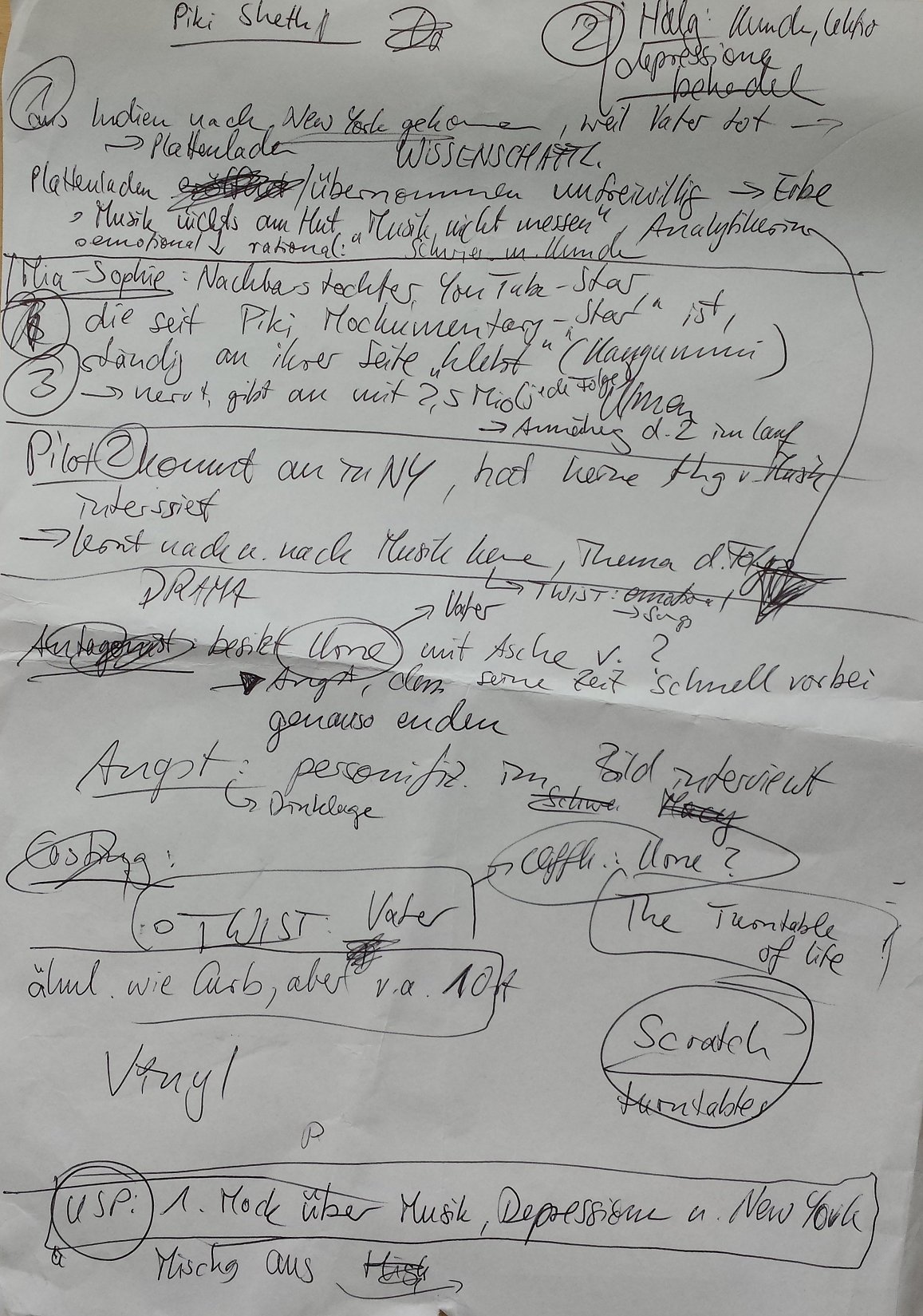 Unter den Vorgaben findet sich auch das Muss für einen Twist oder Cliffhanger. Dazu habe ich mir überlegt, dass man am Ende der ersten Staffel herausfindet, dass Pikis Vater gar nicht tot ist. Weiter habe ich darüber noch nicht nachgedacht, schließlich wird das in vielen anderen Serien bei solchen Twists erst einmal auch nicht gemacht. Allerdings mag ich diesen Twist auch nicht besonders, da er vieles von dem, was sich vorher abgespielt hat, entwertet. Zwar wäre es interessant, Piki ihren Vater schließlich tatsächlich noch kennen lernen zu lassen, aber besser fände ich es, zumindest auf derartige unglaubwürdige Wendungen zu verzichten. Die Handlung soll sich lieber langsam, dafür aber realistisch entwickeln und die Serie soll nicht von Cliffhangern leben, sondern von detailliert gezeichneten Charakteren. (Natürlich brauchen wir neben Piki, Mia-Sophie und der Angst noch mehr regelmäßig auftretende Figuren. Vielleicht den Besitzer einer Eisdiele, der seinen Laden neben dem von Piki hat? Gefallen finde ich auch an der Idee, Pikis Vater in Rückblenden zu zeigen.)